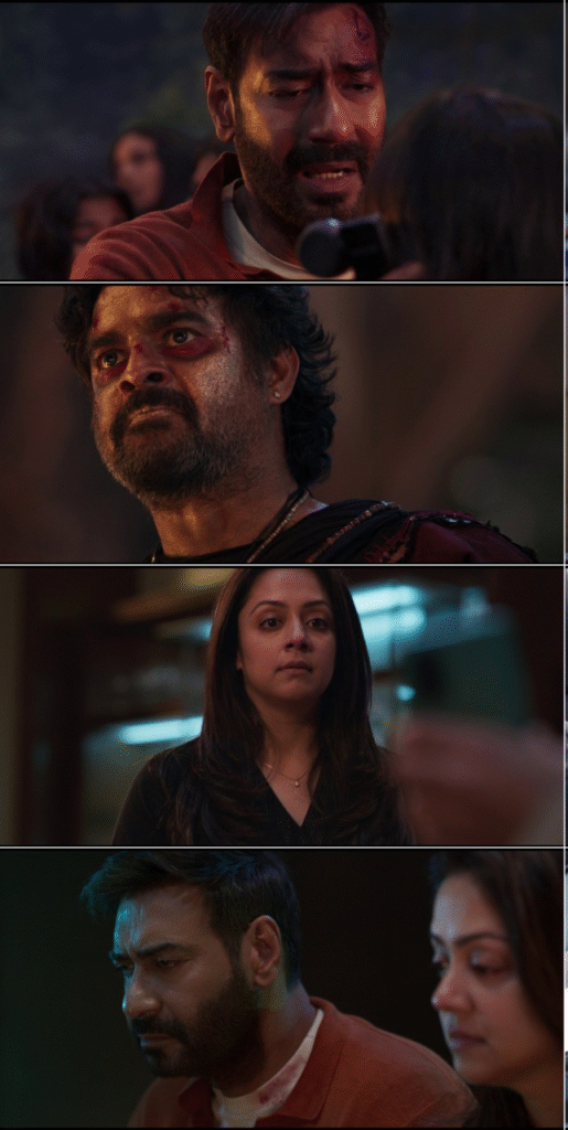 Cast includes Ajay Devgn, R. Madhavan, Janki Bodiwala, Jyotika, Palak Lalwani, Anngad Raaj, Manoj Anand, Hiten Patel, Richa Prakash, Roshni Kaur, and Kishore Bhatt.
